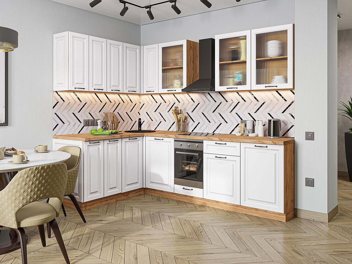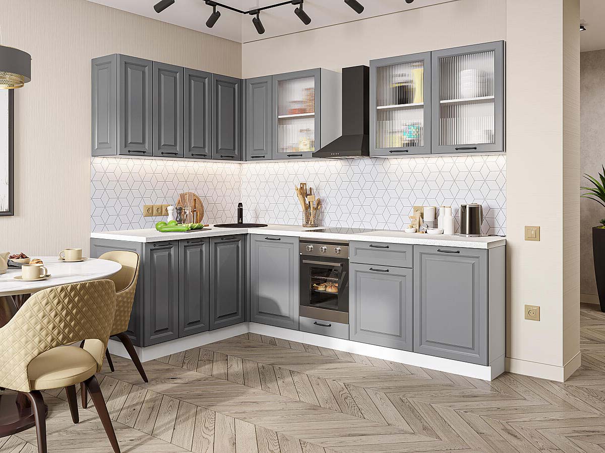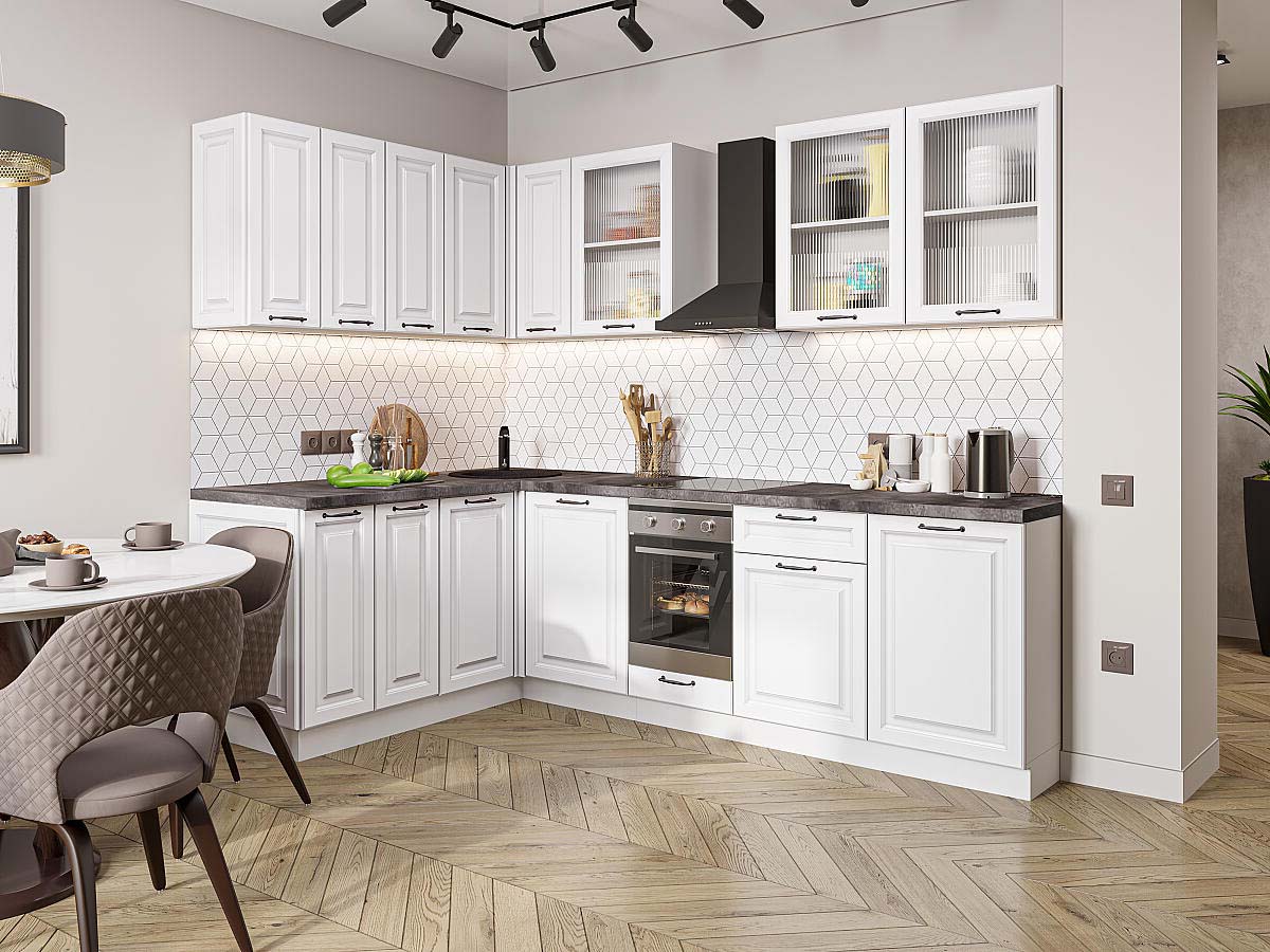 | Преимущества: | Фасады с элегантной фрезеровкой имитируют классическое филенчатое исполнение, придавая интерьеру дорогой и респектабельный вид. Материал фасадов не боится влаги, перепадов температур и частой уборки — кухня останется безупречной даже спустя годы |