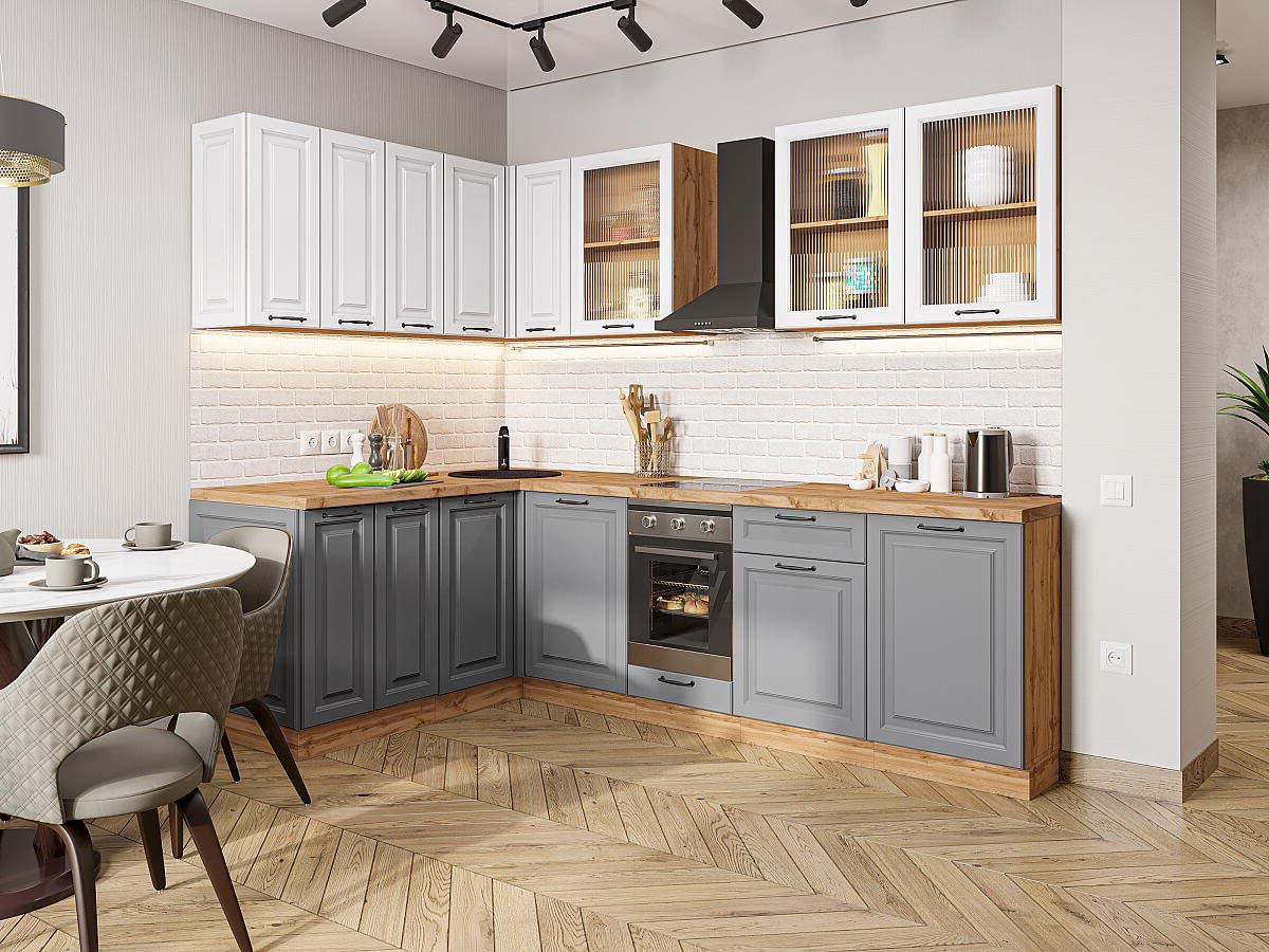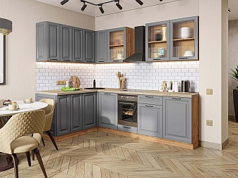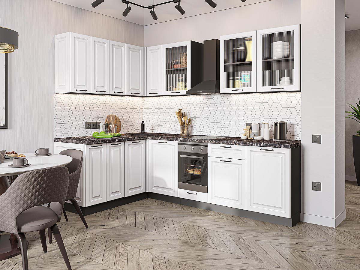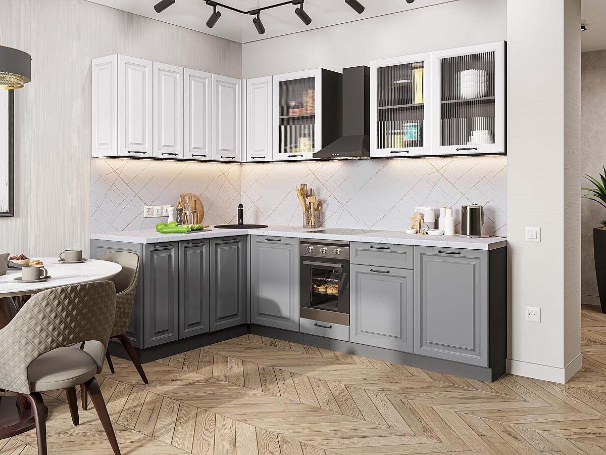 | Преимущества: | Фасады с элегантной фрезеровкой имитируют классическое филенчатое исполнение, придавая интерьеру дорогой и респектабельный вид. Материал фасадов не боится влаги, перепадов температур и частой уборки — кухня останется безупречной даже спустя годы |